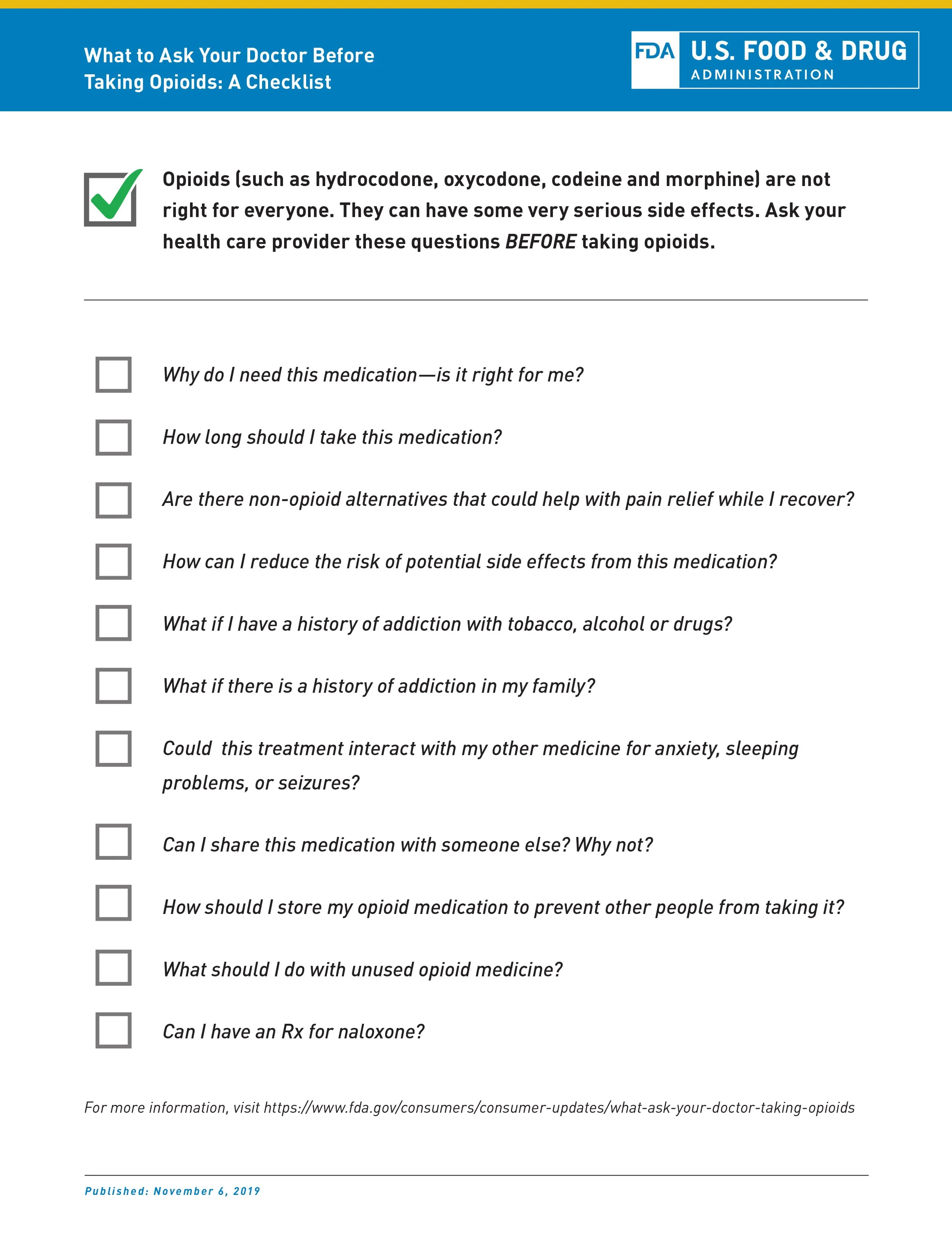 Here is a downloadable asset that you can save with questions to ask your doctor before taking opioids.